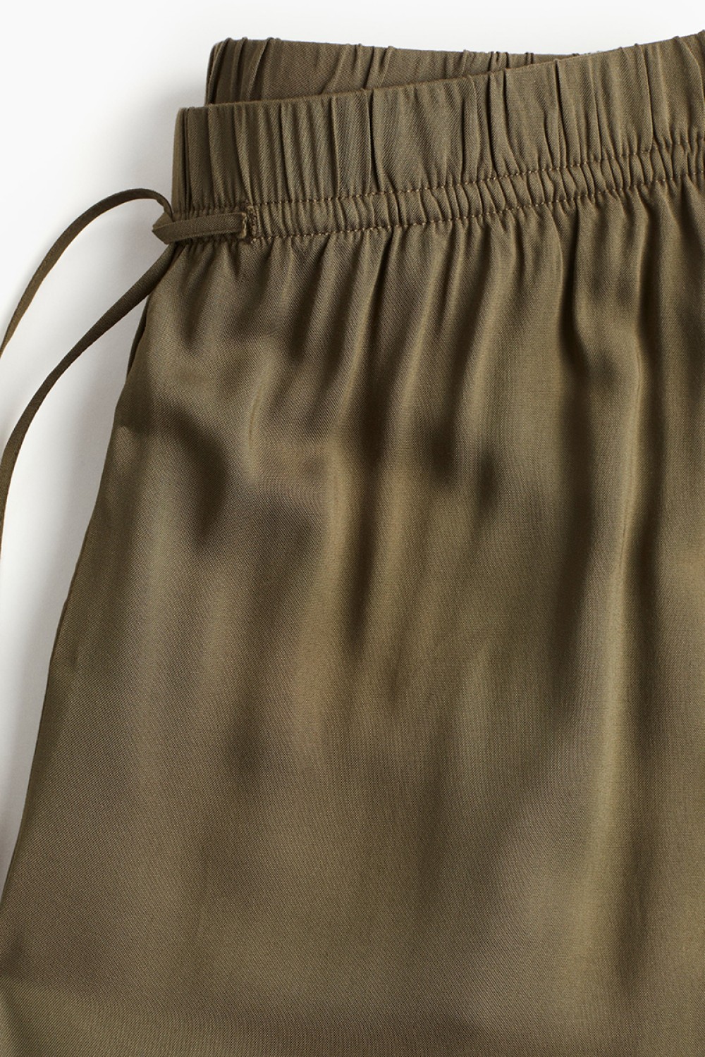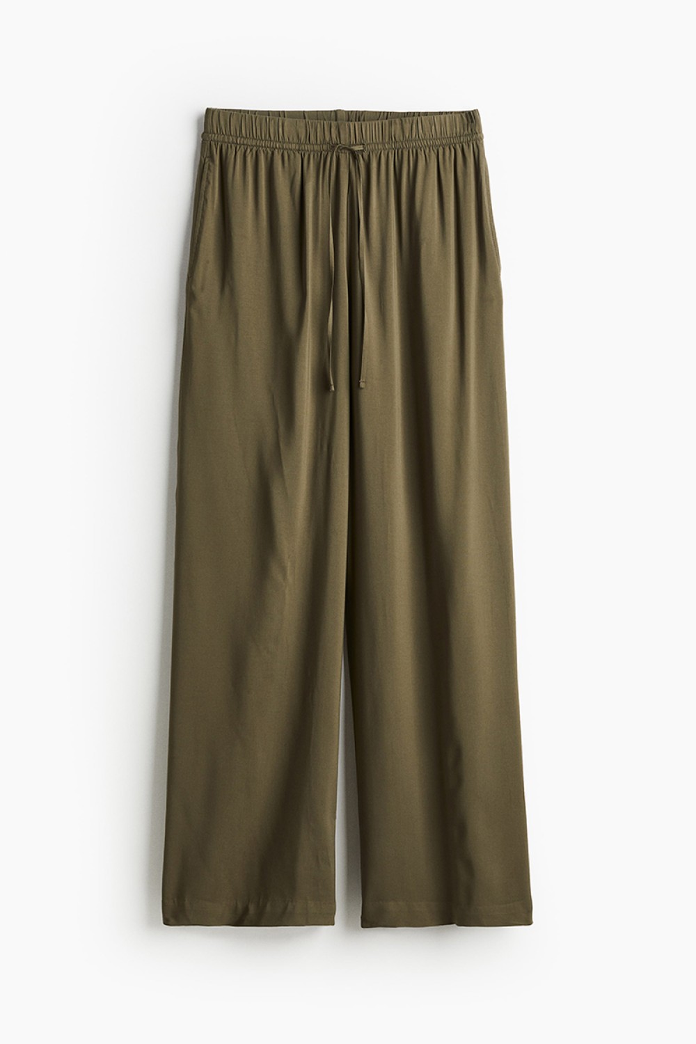 Loose-fit pants in airy, woven viscose fabric. High waist, narrow drawstring and covered elastic at waistband, and discreet side-seam pockets. Straight, wide legs.