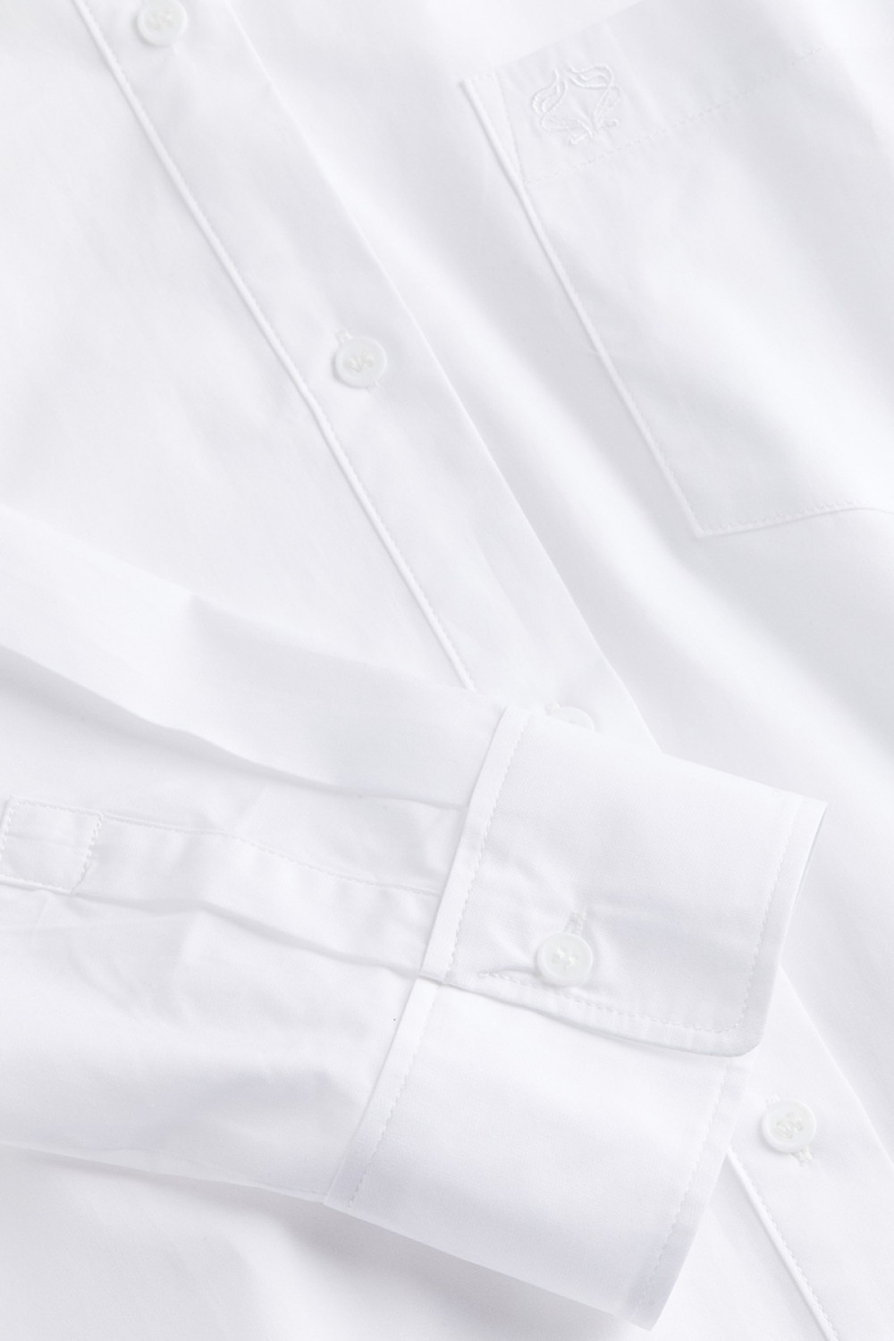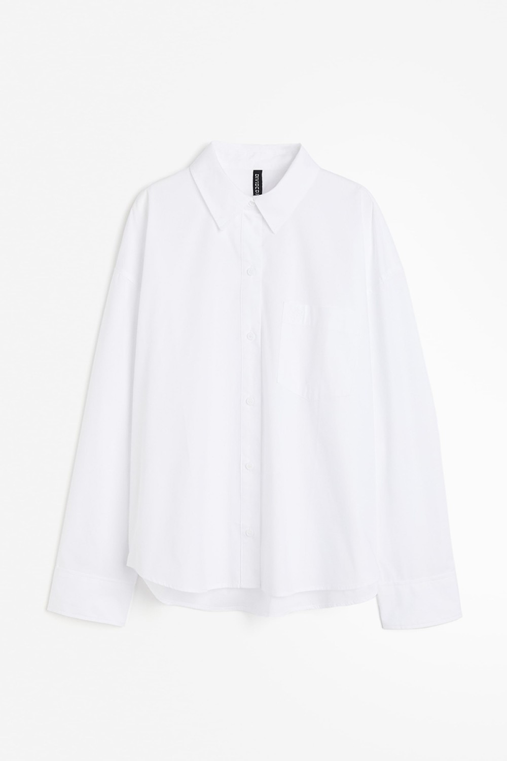 Oversized shirt in soft, woven cotton fabric. Collar, buttons at front, and a patch chest pocket with an embroidered detail. Yoke at back with box pleats, dropped shoulders, and long sleeves with button at cuffs. Gently rounded hem, slightly longer at back.