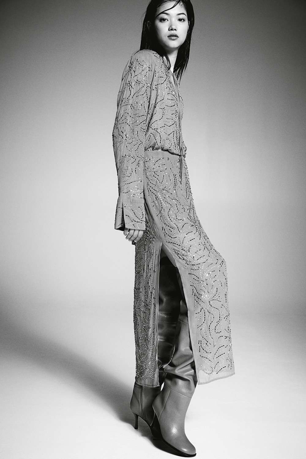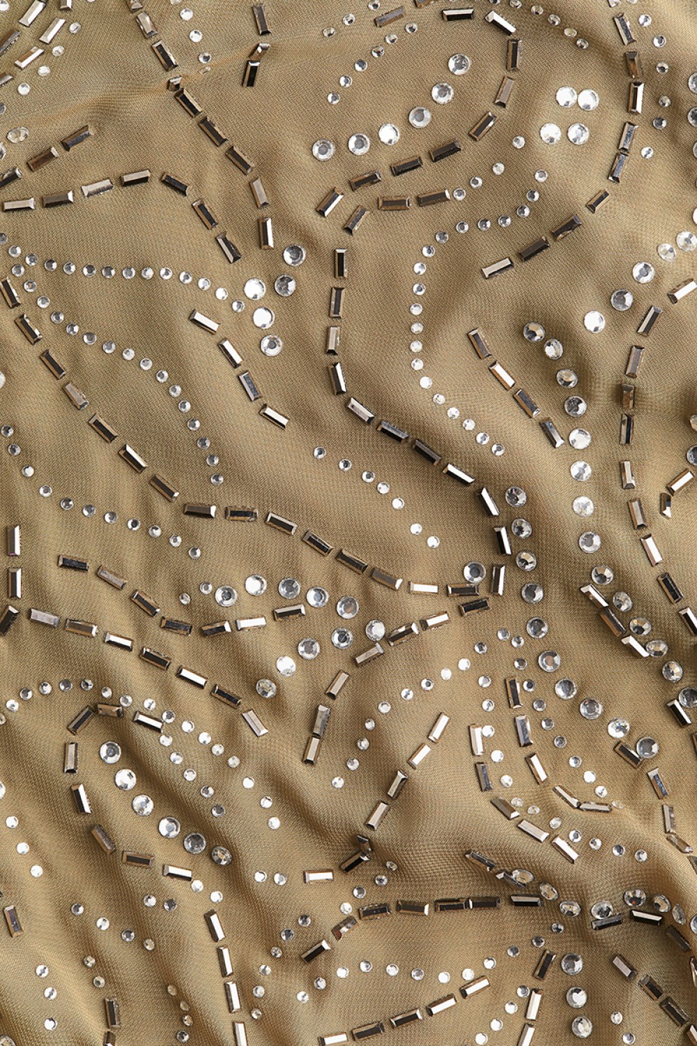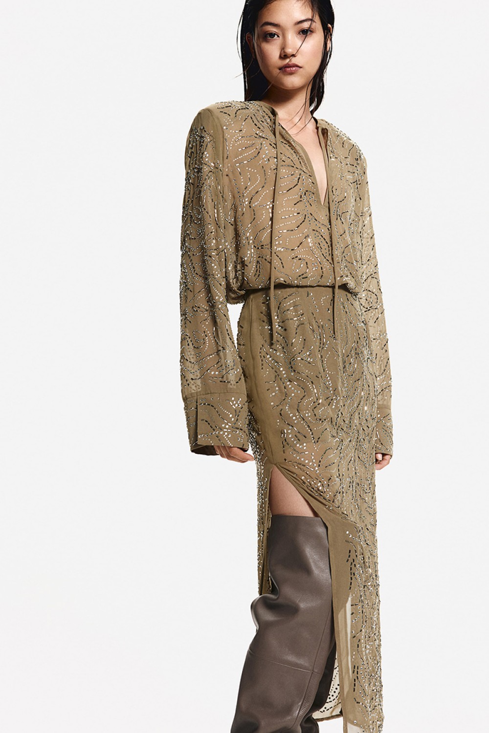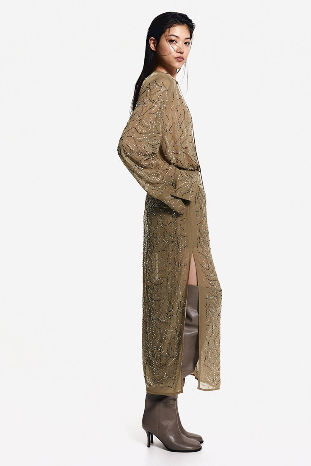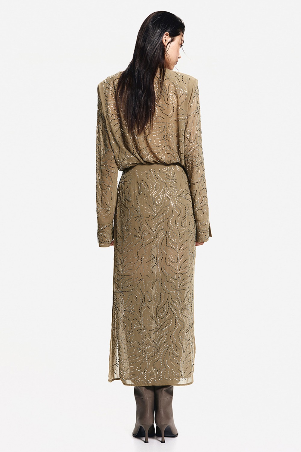Ankle-length skirt in sheer chiffon with a pattern made of sparkling rhinestones and metal beads in various designs. Low waist, concealed zipper at one side with hook-and-eye fastener, and discreet side pockets. Straight-cut hem with a high slit at sides. Lined.