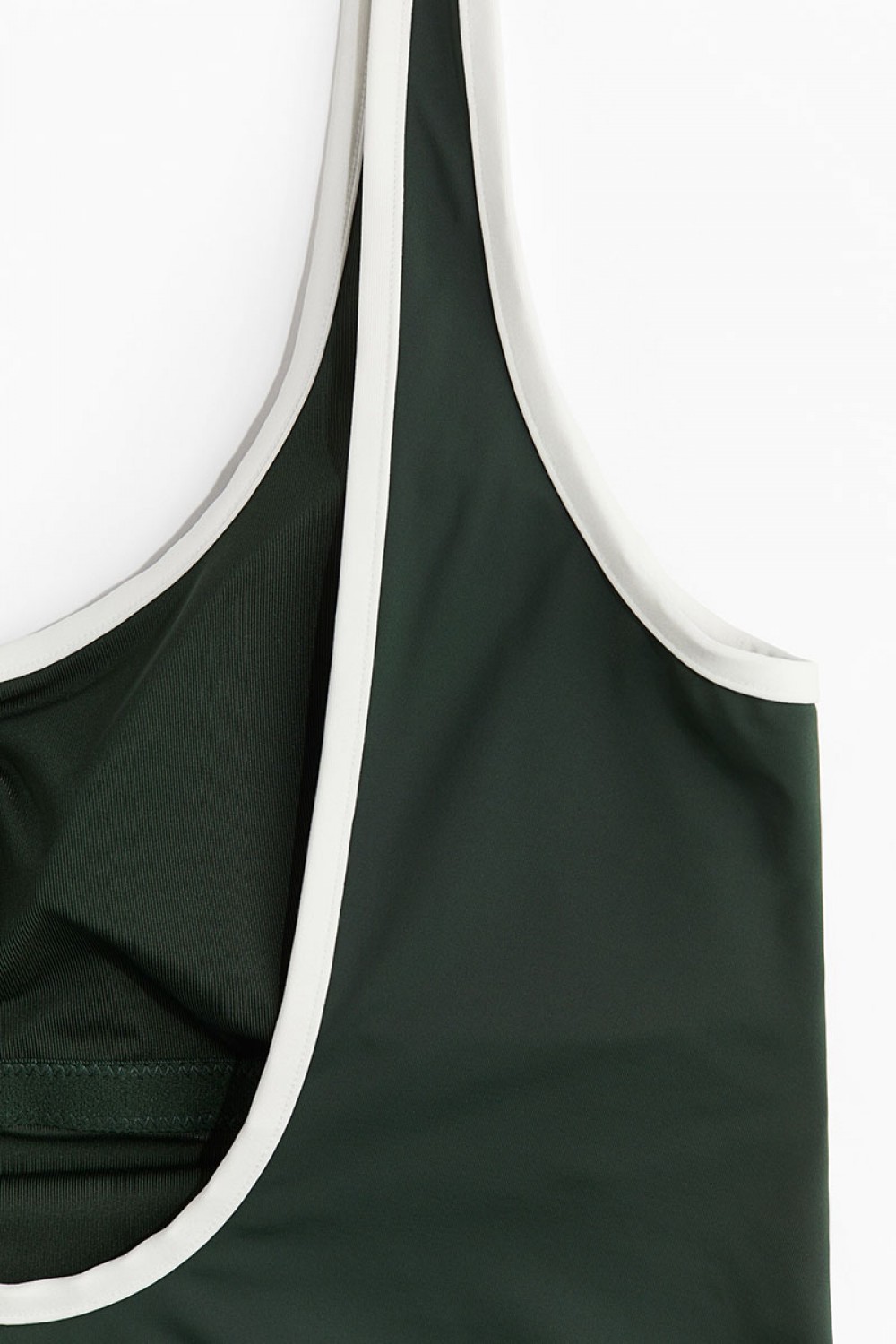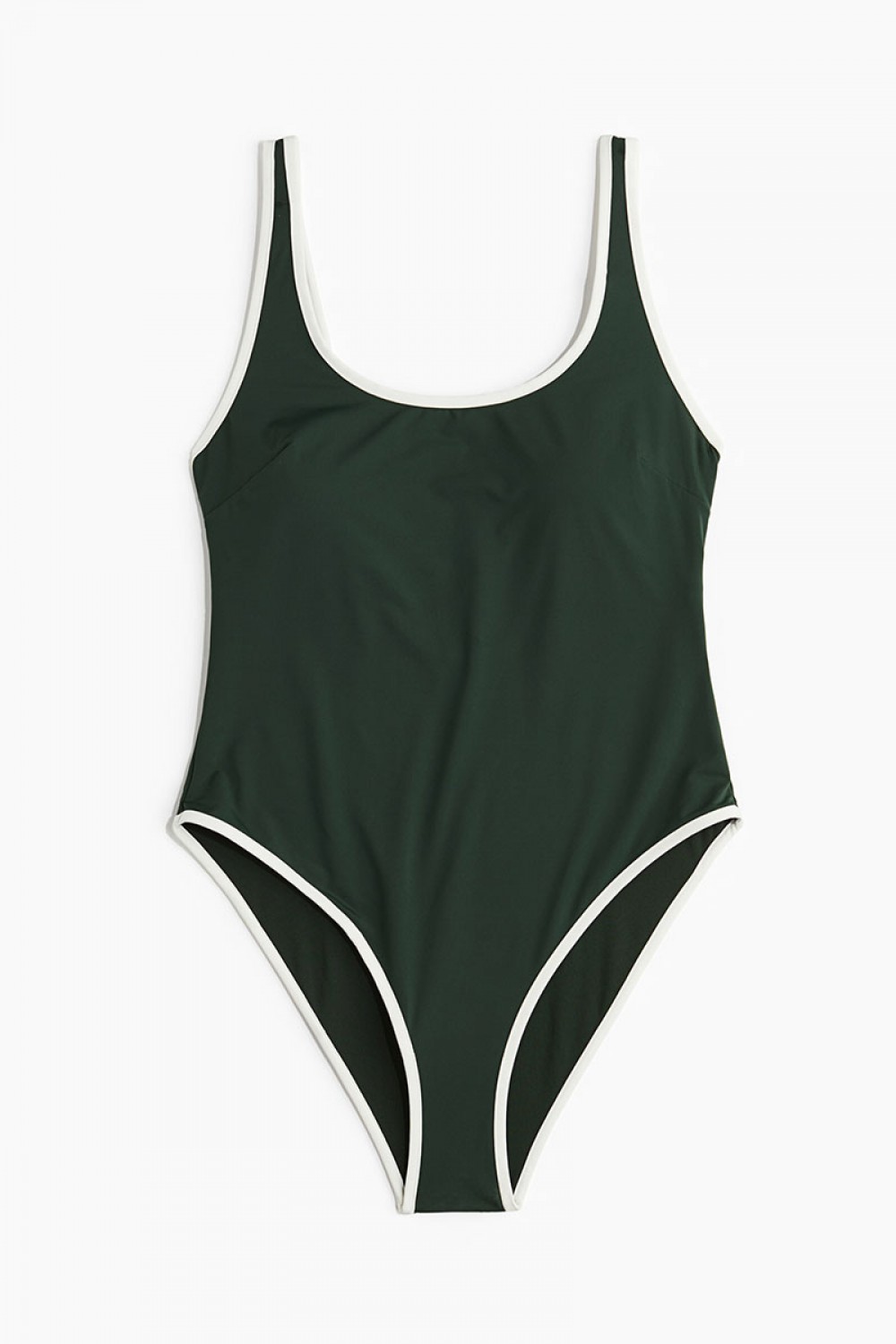 Fully lined swimsuit with square neckline. Scoop neck at back, cups with removable inserts for shaping and good support, and high-cut legs. Cutaway coverage at back.