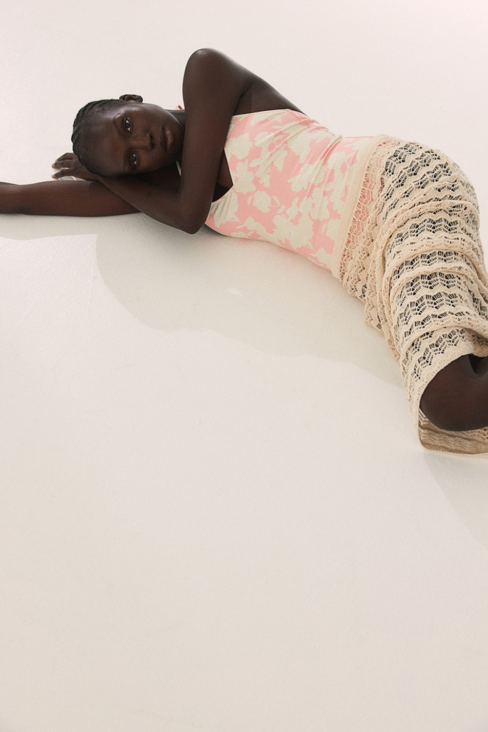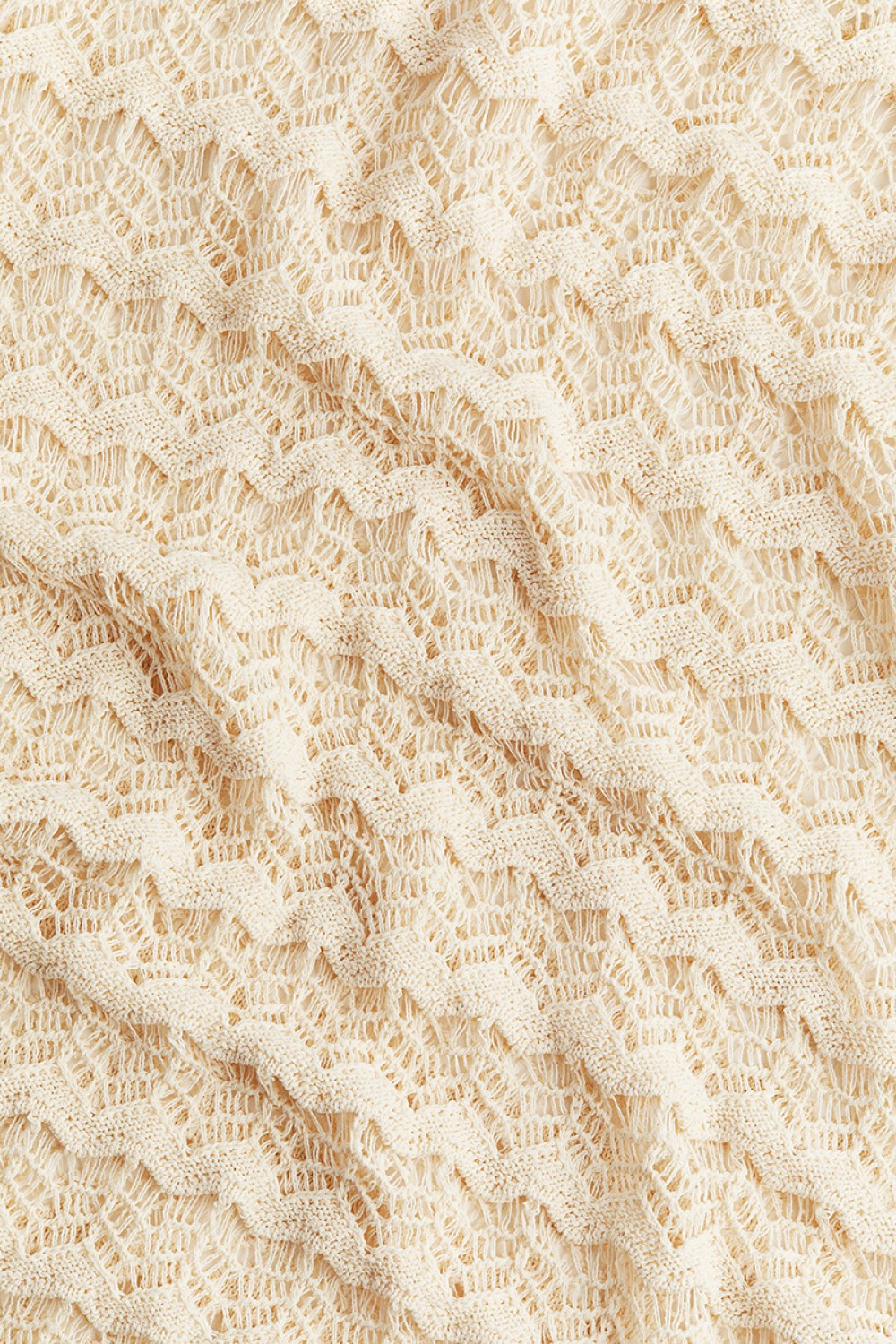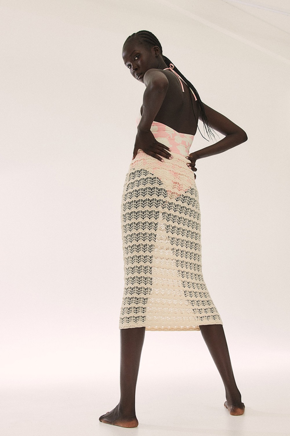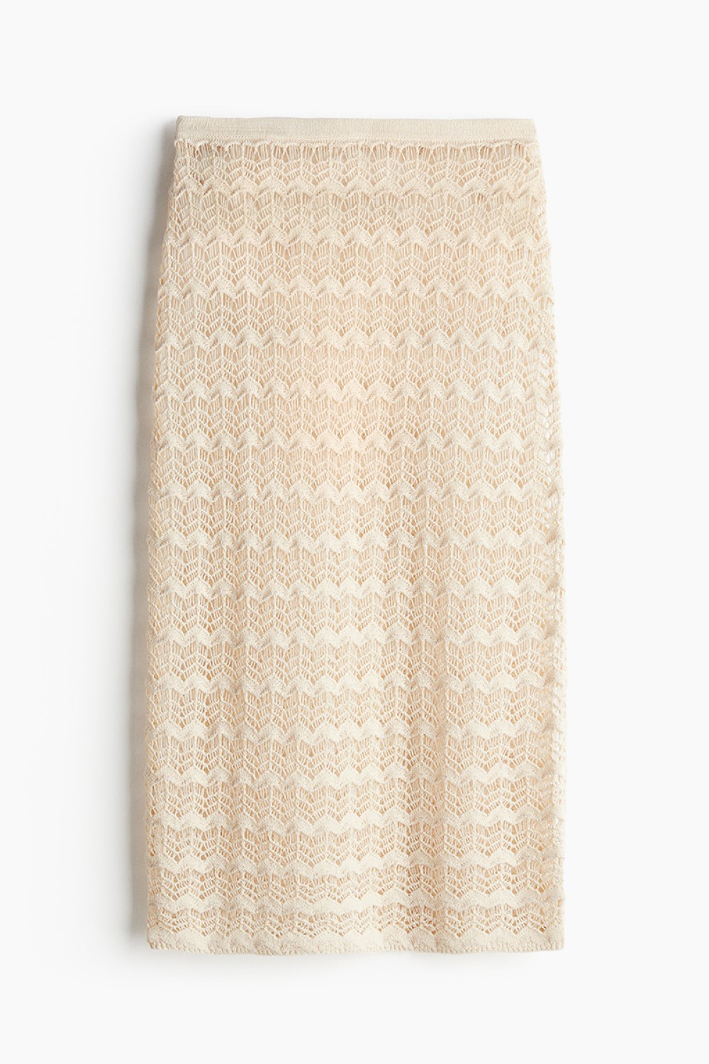 Calf-length beach skirt in a soft pointelle knit. Ribbed, elasticized waistband and a straight hem. Unlined.