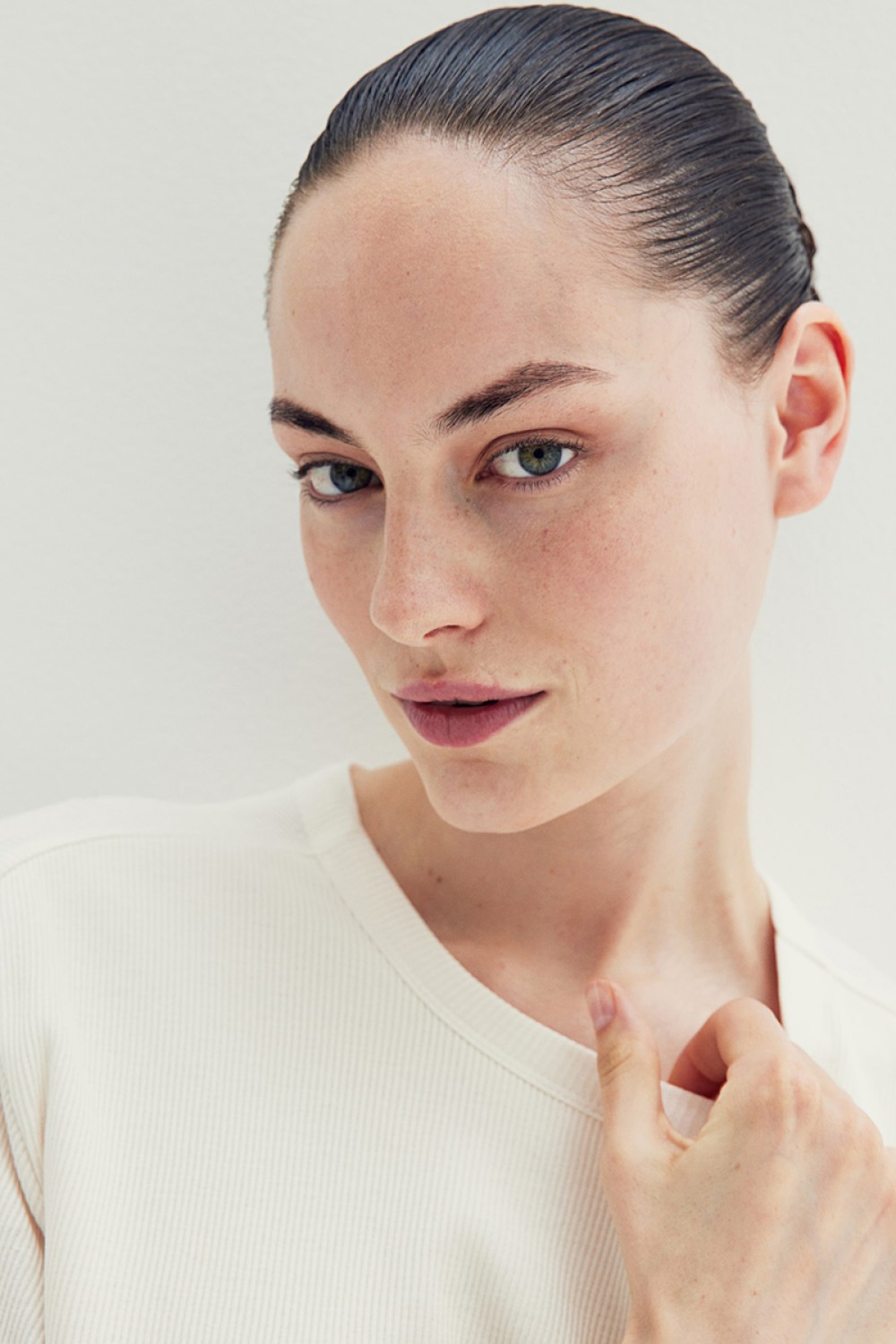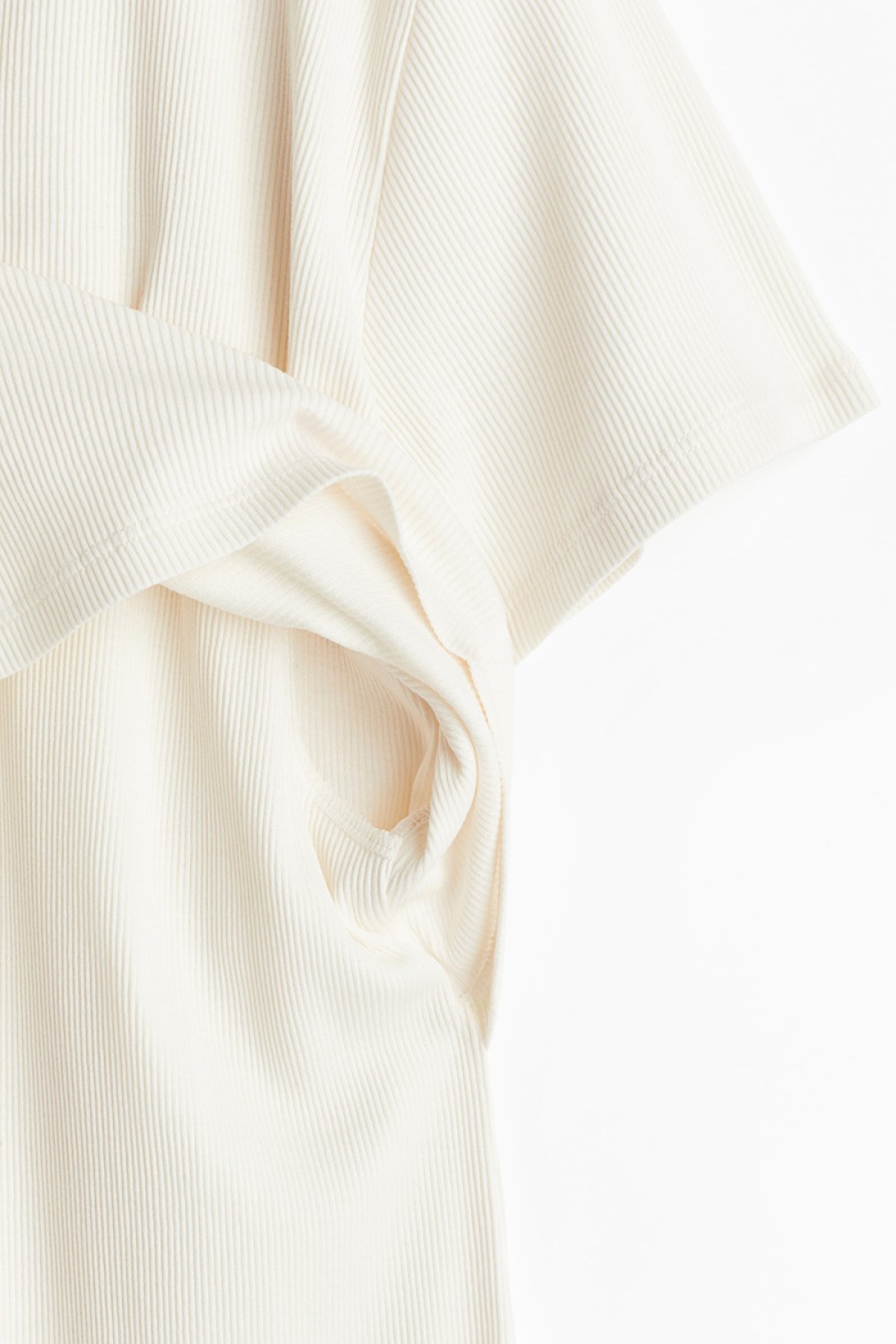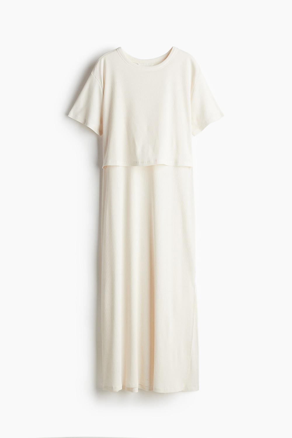 Loose-fit, calf-length nursing dress in soft, ribbed jersey. Round neckline, short sleeves, and a unique nursing feature – double layers at top help retain warmth while allowing easier nursing access.