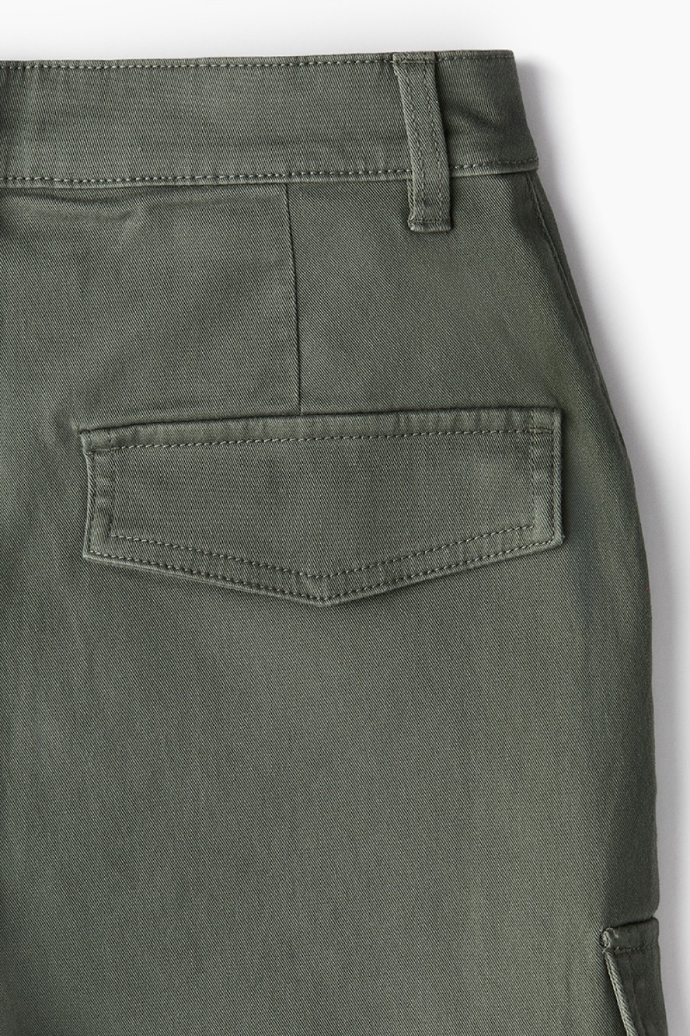 Fitted pants in cotton twill. High waist and zip fly with button. Diagonal side pockets with zipper, mock back pockets with flap, and mock leg pockets with flap. Slim, ankle-length legs with a visible vertical seam at front.