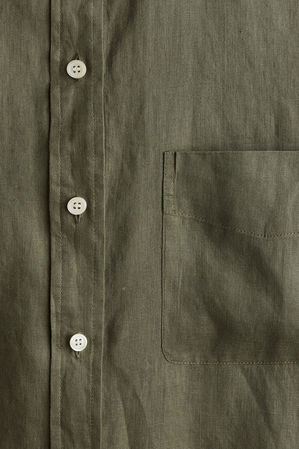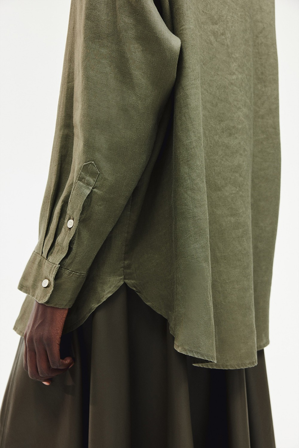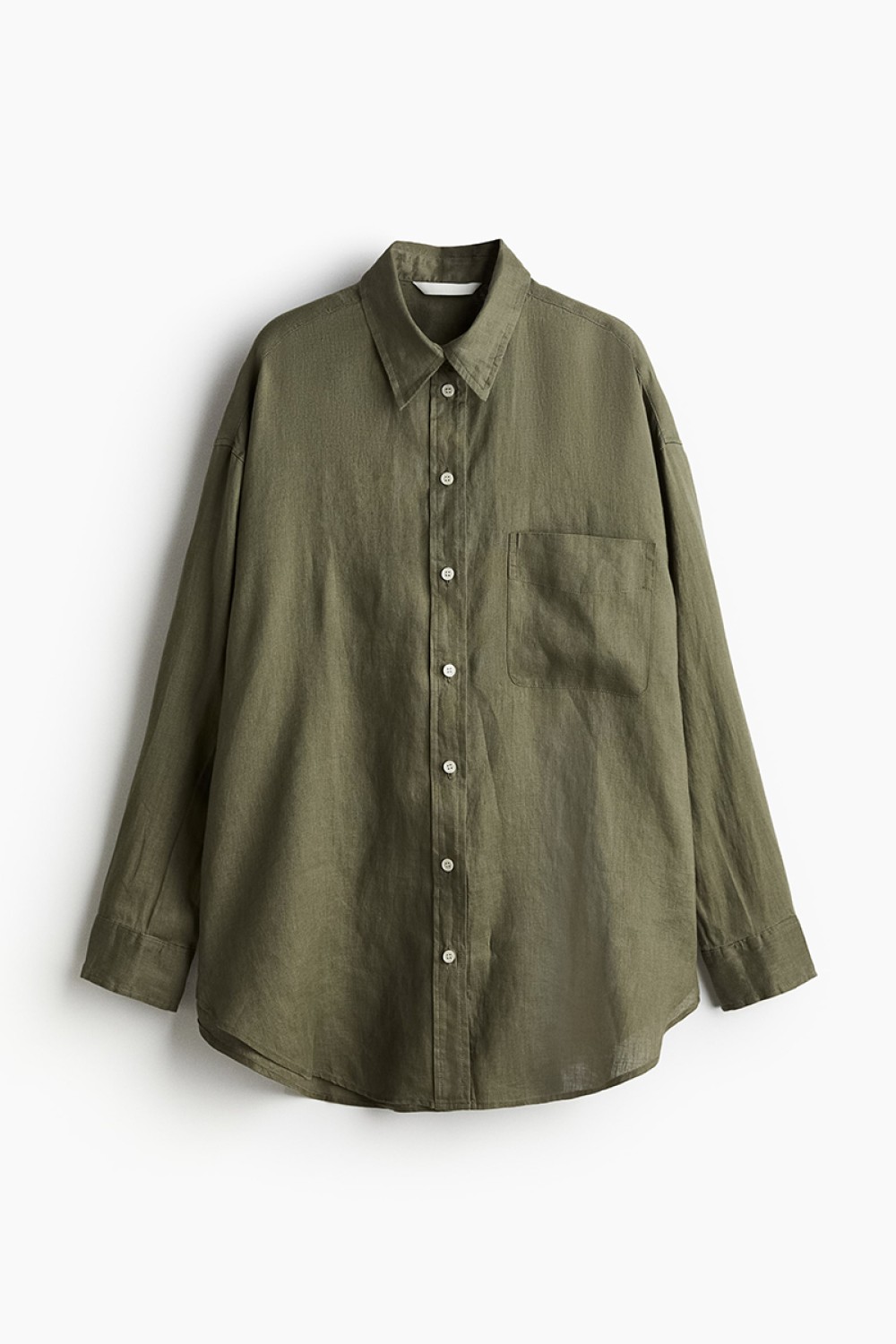 Oversized shirt in airy, woven linen fabric. Collar, buttons at front, a patch chest pocket, and a double-layered yoke at back. Dropped shoulders, sleeve placket with link button, and button at cuffs. Rounded hem.
