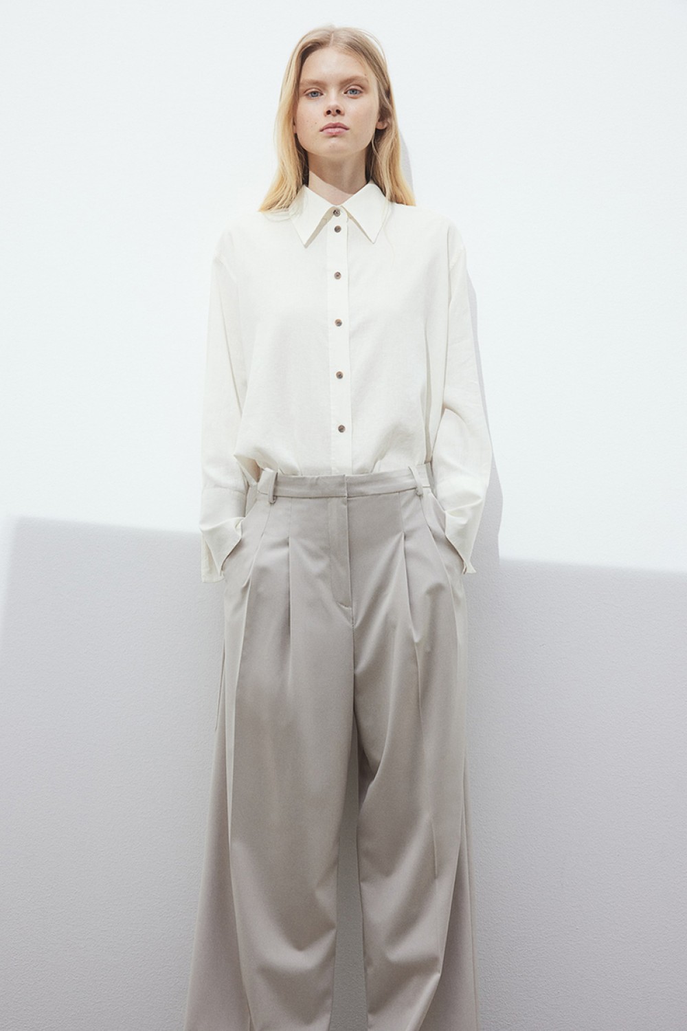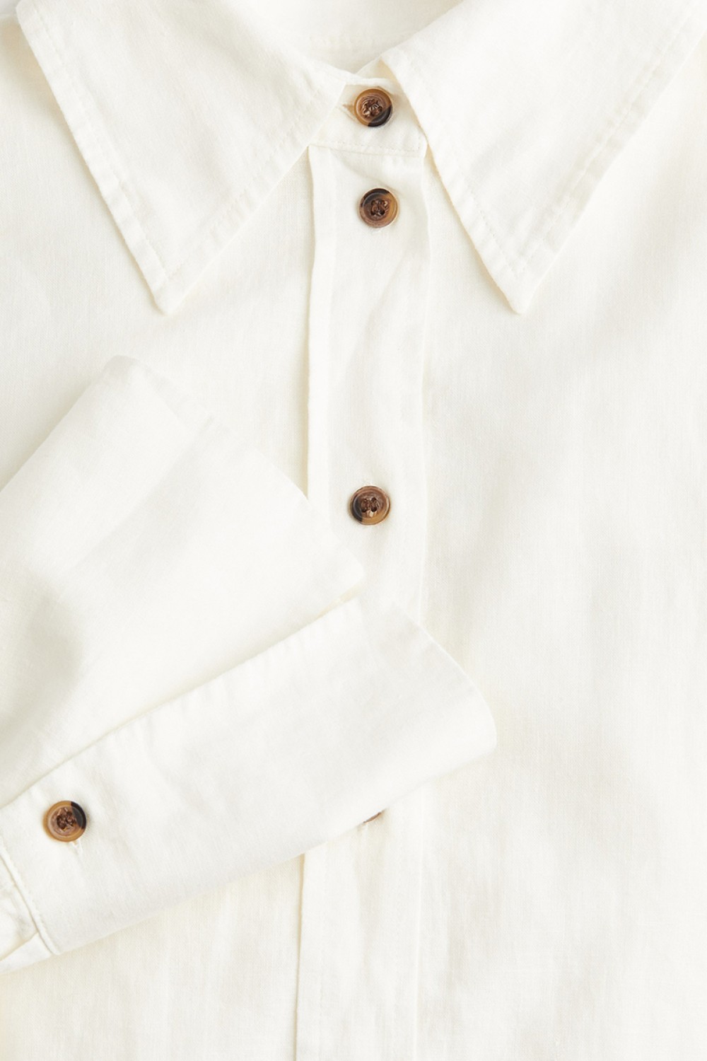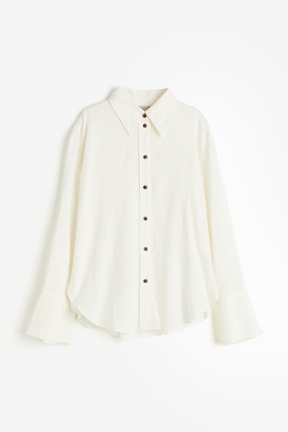 Oversized shirt in a woven linen and viscose blend. Pointed collar, buttons at front, and yoke at back with pleats. Dropped shoulders, long sleeves, and wide cuffs with slit and button. Rounded hem, slightly longer hem at back.