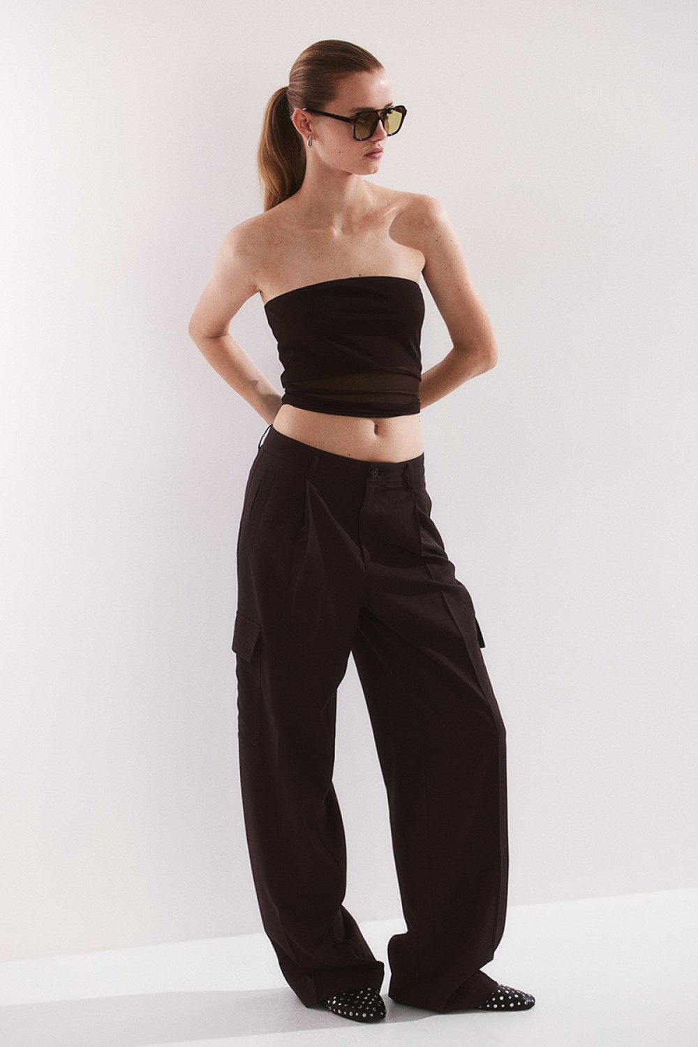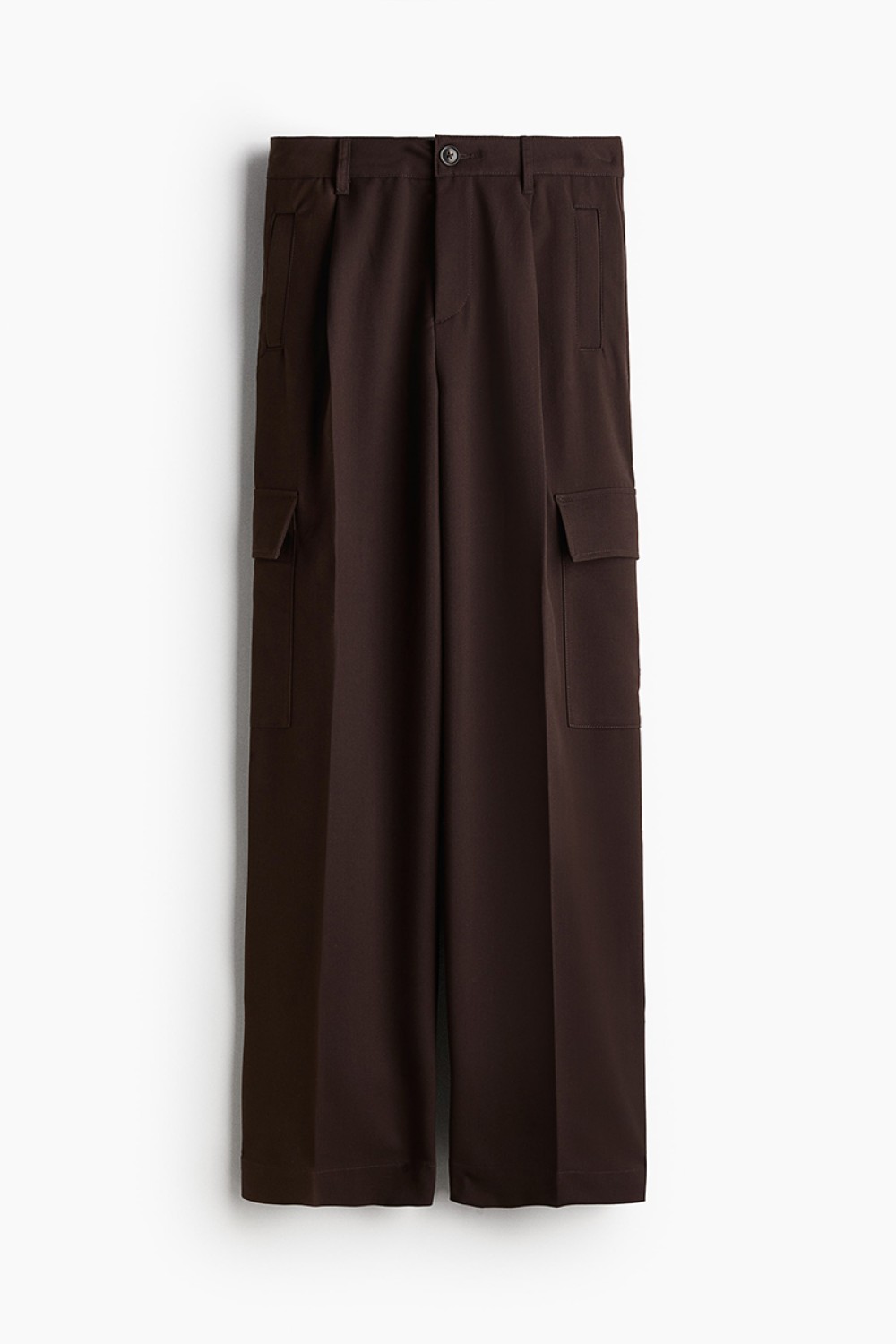 Pants in twill. Zip fly with button, wide legs, and creases at front and back. Welt side pockets, welt back pockets, and leg pockets with flap.